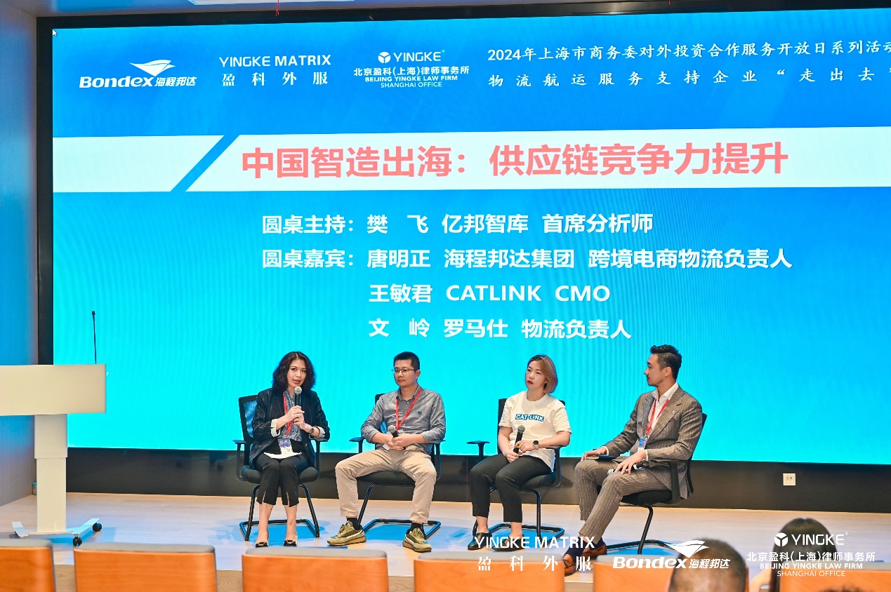 由亿邦智库首席分析师樊飞,海程邦达集团跨境电商物流负责人唐明正,CATLINK CMO王敏君,罗马仕物流负责人文岭等嘉宾带来的圆桌讨论环节更是将当日活动推向了高潮。几位嘉宾围绕“中国智造出海:供应链竞争力提升”的主题展开了深入而热烈的讨论。他们不仅探讨了当前中国制造企业出海面临的机遇与挑战,还就如何通过优化供应链管理、加强技术创新、塑造国际品牌等策略来提升中国制造的全球竞争力提出了真知灼见。