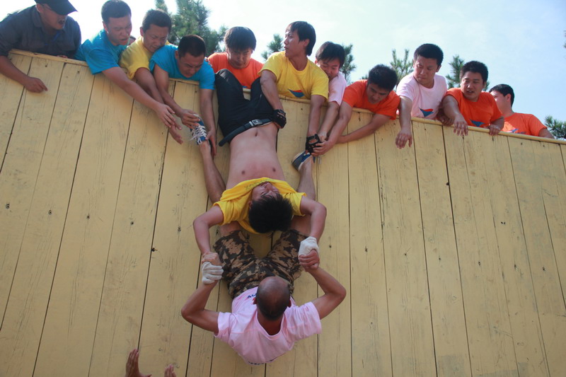 成功取决于坚持到底、永不放弃,创造奇迹往往就在一瞬间。“求生墙”上大家是一个优秀的团队,已经没有了组别界限、没有了男女界限,已经不是一个个独立的个人,而是一个坚不可摧的团队,大家真真切切体会到了“团队可以创造奇迹”。从这个团体项目中我们看到了真诚,看到了朴实,看到了为达目标众人协力、甘于奉献、永不认输的动人一幕,感受着我们亲爱的同事们带来的震撼。搭人墙的,一层不够两层……第一个上去了,第二个上去了……;先上去的,一上去后马上回头将同伴一个一个的往上拽、往后拉……当张育铭和吴炯两位同事利用倒挂金钩的高难度动作翻越求生墙的那一刻,呼吸瞬间暂停了,紧接着就是狂热的欢呼:“我们胜利了”这就是团队的生命力充分的发挥,是人性自然的要求。人生旅途中,唯有遇到逆境才能激发潜在的能量,充分利用生命中那些优秀的潜能,超越自我。