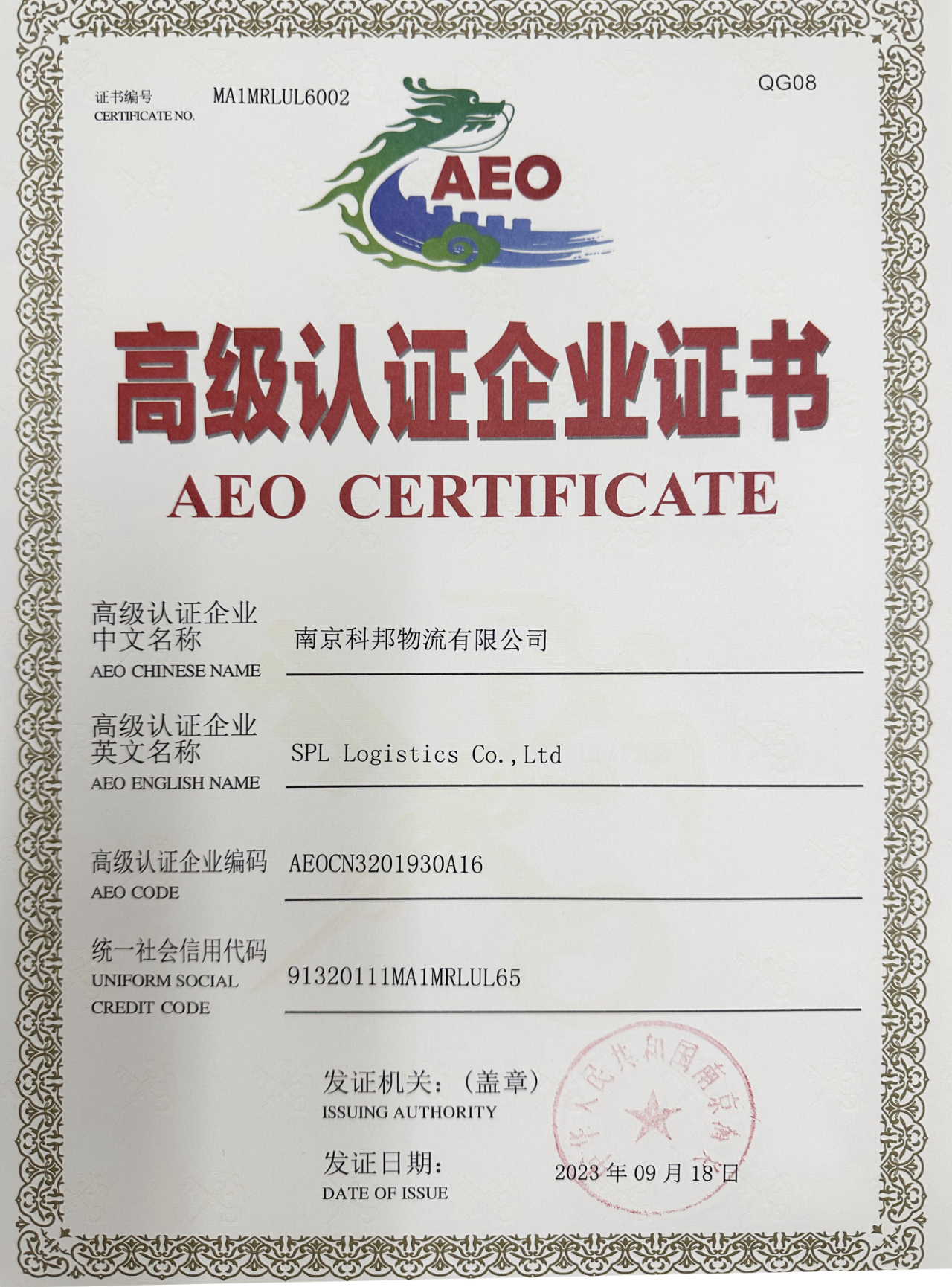 9月18日,南京科邦物流有限公司顺利通过海关AEO高级认证。AEO是海关授予企业的最高信用等级,企业获得海关AEO高级认证资质,可享受到“海关最便捷、国内最优惠、国际最认可”三个维度的优惠措施。
