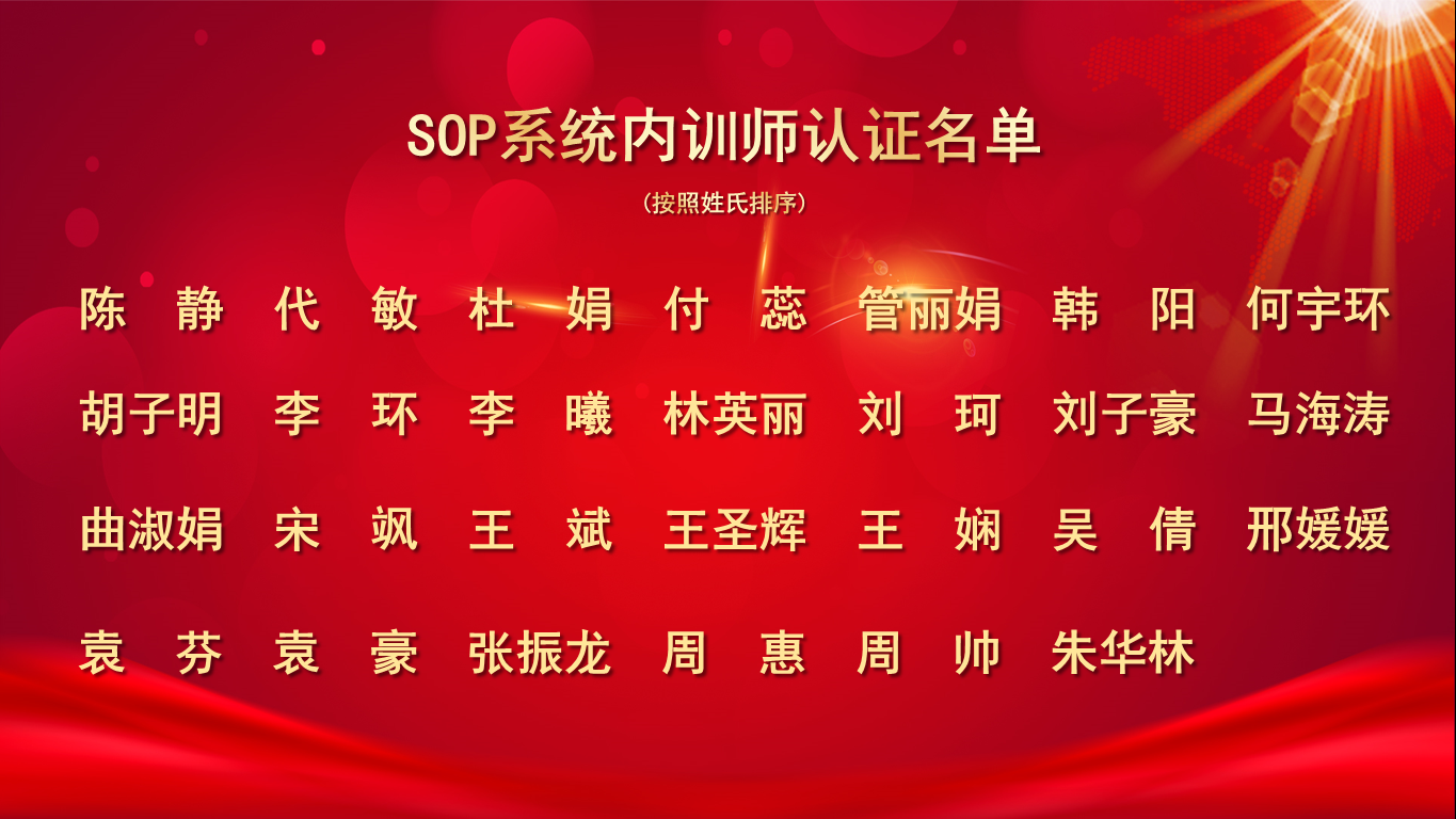 2021年1月7日,由流程管理部和人力资源发展部联合各业务单元开展的 “SOP系统内训师项目”历时7个月圆满收官。根据认证考核成绩、出勤率、作业完成率等积分情况,经SOP项目组综合考评,27名内训师通过认证。